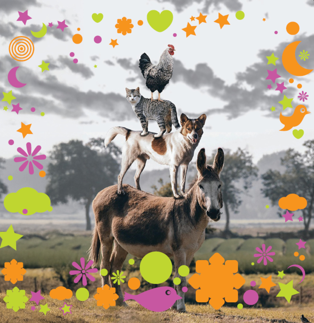 Živali se na poti srečajo in se odločijo, da bodo pot nadaljevale skupaj in se preživljale kot godci. Na poti prot Bremnu prečkajo gozd in prispejo do hiše z razbojniki. Da bi jih pregnali, se živali postavijo druga na drugo, v en glas zakričijo in s tem tako prestrašijo razbojnike, da ti pobegnejo. Živali se nato tako udobno namestijo v razbojniški hiši, da poti v Bremen ne nadaljujejo več – ostanejo v hiši in si ustvarijo novo skupno življenje.